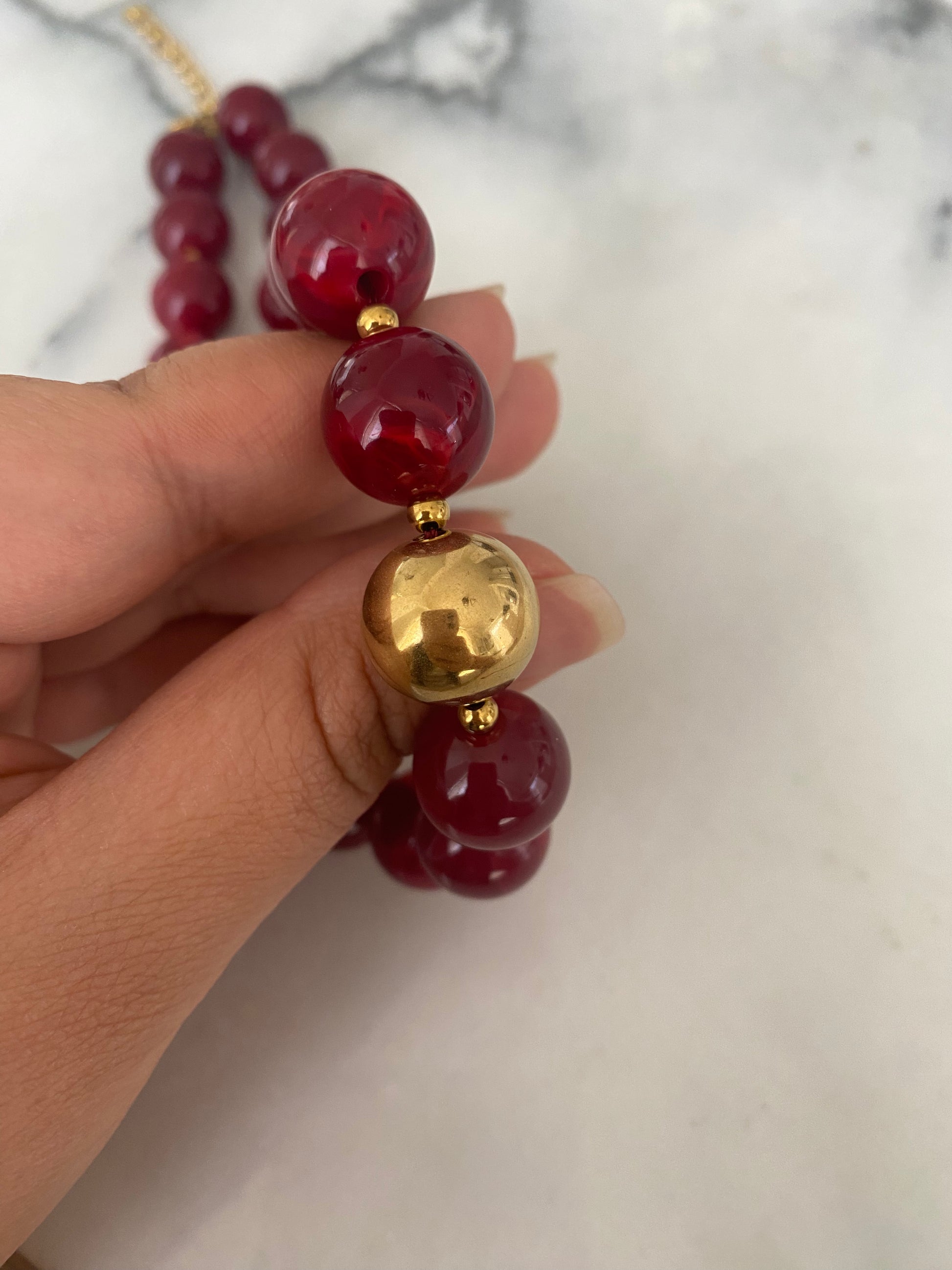 Maravilloso Collar de piedras preciosas emperladas color burdeo con perla dorada en medio, amado para realzar tus looks Chic ♡!
